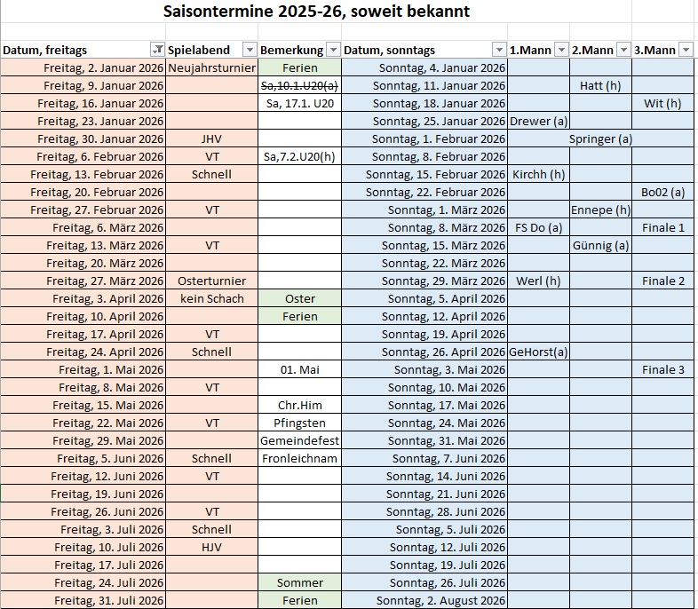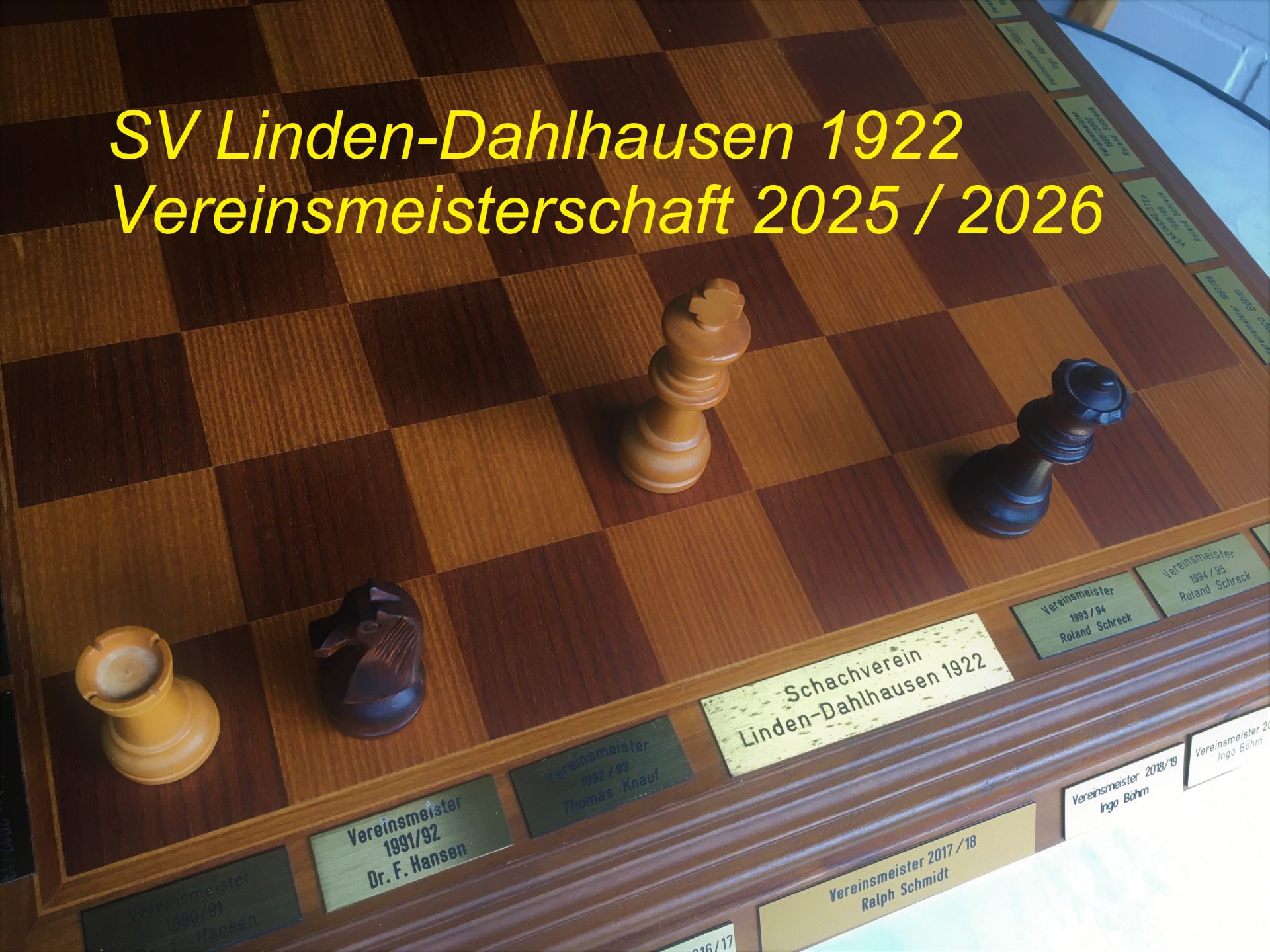 Das diesjährige Vereinsturnier startet am 6. Februar 2026. (Für potenzielle Teilnehmer, die im Februar wenig Zeit haben, steht ebenfalls der 30. Januar zur Verfügung, da wir organisatorisch bedingt doch keine Jahreshauptversammlung im Januar ausrichten werden.) Bis 10 Teilnehmende (ich hoffe auf deutlich mehr) spielen wir vollrundig, ab 11 Teilnehmer 7 Runden Schweizer System. Bedenkzeit 70min für die Partie + 30s pro Zug. Titelverteidiger ist Andriy. Die Plantermine könnt ihr unserer Terminliste entnehmen. (Ingo)