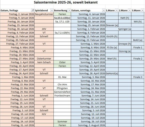 Das diesjährige Vereinsturnier startet am 6. Februar 2026. (Für potenzielle Teilnehmer, die im Februar wenig Zeit haben, steht ebenfalls der 30. Januar zur Verfügung, da wir organisatorisch bedingt doch keine Jahreshauptversammlung im Januar ausrichten werden.) Bis 10 Teilnehmende (ich hoffe auf deutlich mehr) spielen wir vollrundig, ab 11 Teilnehmer 7 Runden Schweizer System. Bedenkzeit 70min für die Partie + 30s pro Zug. Titelverteidiger ist Andriy. Die Plantermine könnt ihr unserer Terminliste entnehmen.