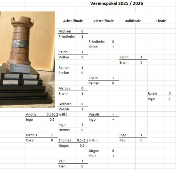 Durch die spontane Ansetzung des Pokalfinales sowie die Auslosung der Farben direkt vor der Partie, ergibt sich zwischen Ralph und Ingo eine recht unübliche Eröffnungsgestaltung. Ralph, mit den weißen Steinen, gerät etwas unter Druck und entscheidet sich, einen Bauern zu geben. Dafür erhält er einen aktiven Springer, zunächst auf d4 und später sogar auf e6. Im folgenden versuchen Beide, Druck gegen den gegnerischen König aufzubauen. Ingo gegen den mittig platzierten Monarchen mittels eines aktiven Turms auf der 2. Reihe und Ralph mit Springer und Dame mit Blick auf h- und offene g-Linie. Als er den Turm über die 3. Reihe eigentlich erfolgsverdächtig hinzubringt, übersieht er den Konter der schwarzen Dame, die auf dem unauffälligen Feld g6 vieles deckt, aber plötzlich durch den Bauernzug f5-f4 auf b1 Matt droht. Es gibt keine brauchbare Verteidigung mehr und der Vereinspokal 2025/2026 ist vorbei. (Ingo)