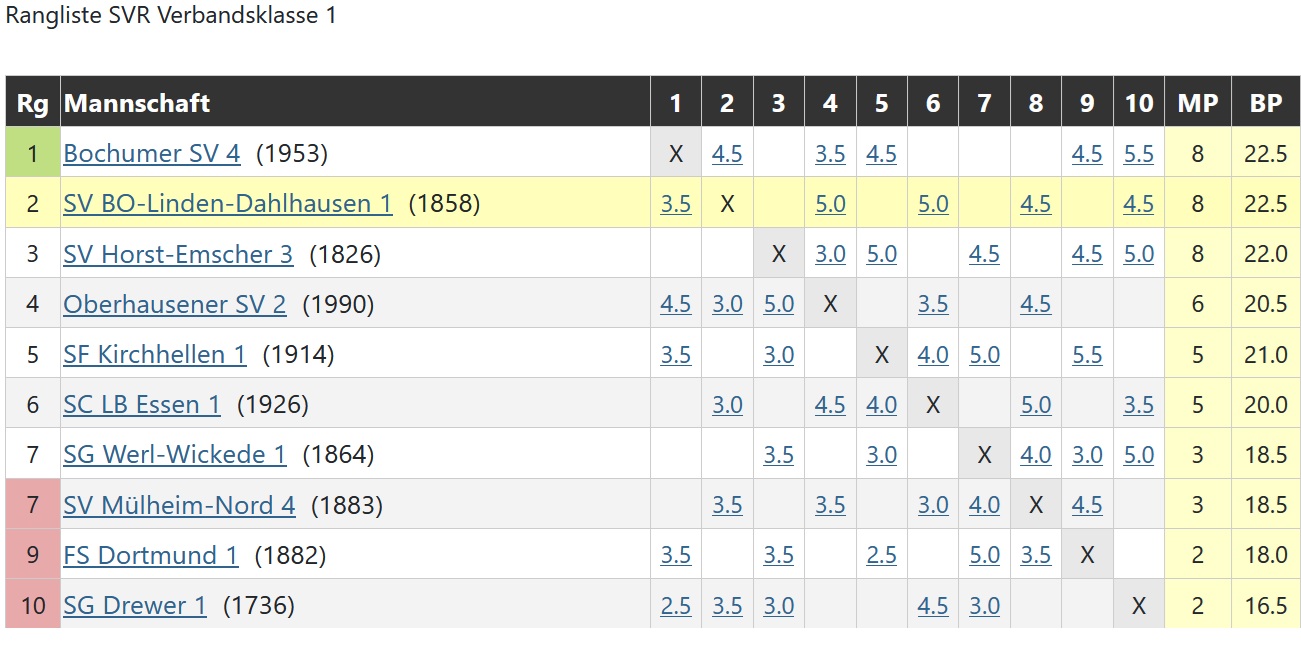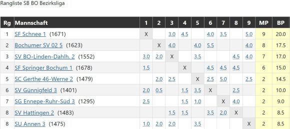 Die Zweite siegt im Heimspiel gegen Hattingen in unter 2 Stunden. Remise von Friedhelm, Jürgen und Michael und schnelle Siege von Thomas, der im besser ins Rollen kommt, Egor (leider ohne Kontrahenten) und natürlich Oskar mit nun 5 aus 5. Durch den 4,5:1,5-Sieg bleinen wir Bo02 und Schnee auf den Fersen. (Ingo)