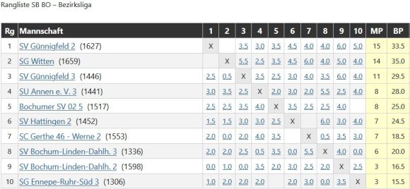 Als haushoher Favorit empfängt Linden 2 unsere Gäste aus Gerthe, an jedem Brett verzeichnen wir deutlichen DWZ-Vorteil, trotzdem entscheidet sich die Begegnung mehr als knapp. Der Nachteil für unseren ersatzgeschwächten Gegner ist besonders an den Brettern 4-6 spürbar. Michael, Oscar und Oskar (nun 3 aus 3, Glückwunsch) fahren drei Siege ein. Jürgen an Brett 2 gelingt ein wichtiges Remis, denn Friedhelm an 1 und Thomas an Brett 3 unterliegen. 3,5:2,5 - passt gerade. Damit sortieren wir uns in der Tabelle hinter den Topfavoriten Bo 02 und Witten-Schnee ein. Letztere sind unser Gegner im nächsten Auswärtsspiel am 7.12.2025. (Ingo)