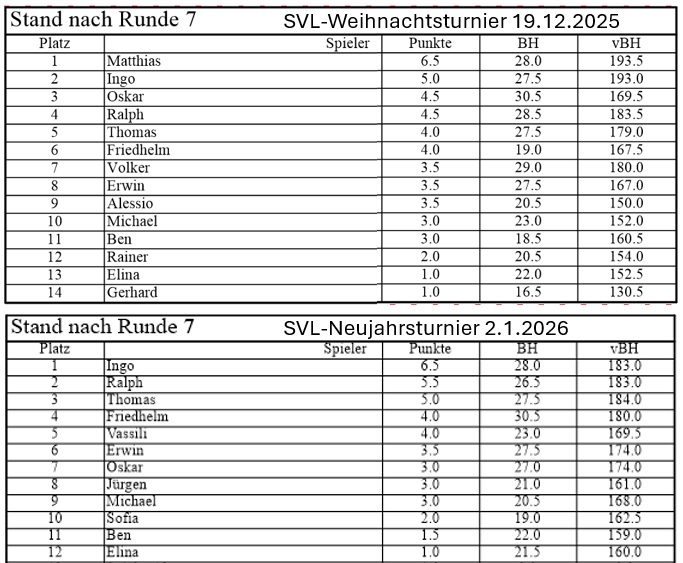 Mit 14 bzw 12 Teilnehmern verpassen wir bei unseren Traditionsturnieren die 16er-Marke nur knapp. Über die Turniere, ausgetragen im Schweizer System mit 6min+3sek-Bedenkzeit, gibt es einiges zu berichten. Weihnachtsturnier: Matthias beendet sein überaus erfolgreiches Schachjahr 2025 mit einem klaren Turniersieg. Nur Ingo kann ihm einen halben Punkt abnehmen. Dieser verliert gegen den stark aufspielenden Oskar (guter und hochverdienter 3. Platz) in der Schlussrunde und remisiert gegen Ralph (4.Platz mit 4,5 Punkten). Den Erfolg der Jugendlichen unterstreichen neben Oskar auch Alessio und Erwin mit guten Ergebnissen. Kein Teilnehmender bleibt punktlos. Das Turnier zeichnet durchweg eine sehr entspannte Atmosphäre aus. Die Feier wird mit einem kleinen Snack (Bockwurst im Brötchen, Frikadellen (Danke Ben) und Kartoffelsalat (Danke Friedhelm) abgerundet. Die Getränke spendet unser 90J-Geburtstags"kind" Werner. Vielen Dank Werner!