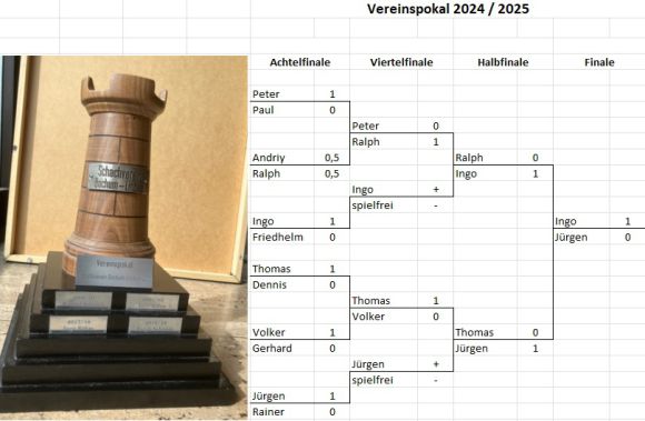 Was ist markant für einen Pokalwettbewerb?! Das Elfmeterschießen, beim Schach ist es das Blitzen. Überraschenderweise spielt es kaum eine Rolle um den diesjährigen Pokal. Von 11 Begenungen werden 10 in der langen Partie entschieden. So passt es natürlich gut, dass das Halbfinale Thomas-Jürgen 0:1 und Ralph-Ingo 0:1 dem Muster folgt. Beides Erfolge mit den schwarzen Steinen. Im Finale hat Ingo schwarz gegen Jürgen, kommt besser aus der Eröffnung und kann im Mittelspiel einen Bauern erobern. Jürgen bleibt dynamisch, gibt im Doppelturm-Endspiel einen zweiten Bauern für aktives Gegenspiel und hält den Laden zusammen. Vom Bauchgefühl läuft es eher auf ein Unentschieden hinaus, Ungenauigkeiten auf beiden Seiten führen aber doch zu einer direkten Entscheidung, was besser zum Turnier passt. Die schwarzen Türme schneiden den weißen König ab, Jürgen verliert dadurch weiteres Material und muss aufgeben. Der Pokalsieger 2024/2025 heißt Ingo. (Ingo)
