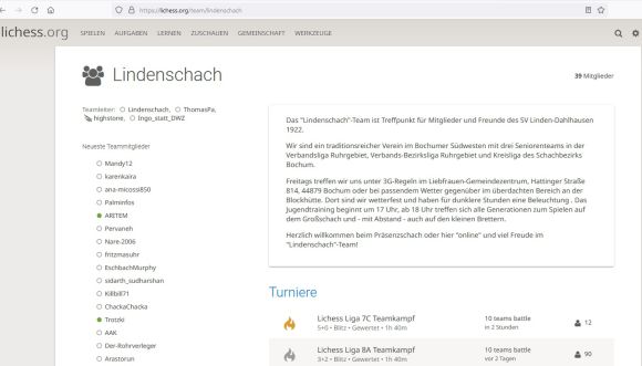 Seit April 2020 sind wir auf www.Lichess.org online in der Quarantäneliga aktiv (https://lichess.org/team/lindenschach). Donnerstags und sonntags wird in den Disziplinen 5min, 3min, 3min+2s rotiert. Das Team um unseren rührigen Käptain Udo, zu dem jeder herzlich eingeladen ist, hat mittlerweile über 150 Turniere absolviert. (Ingo)